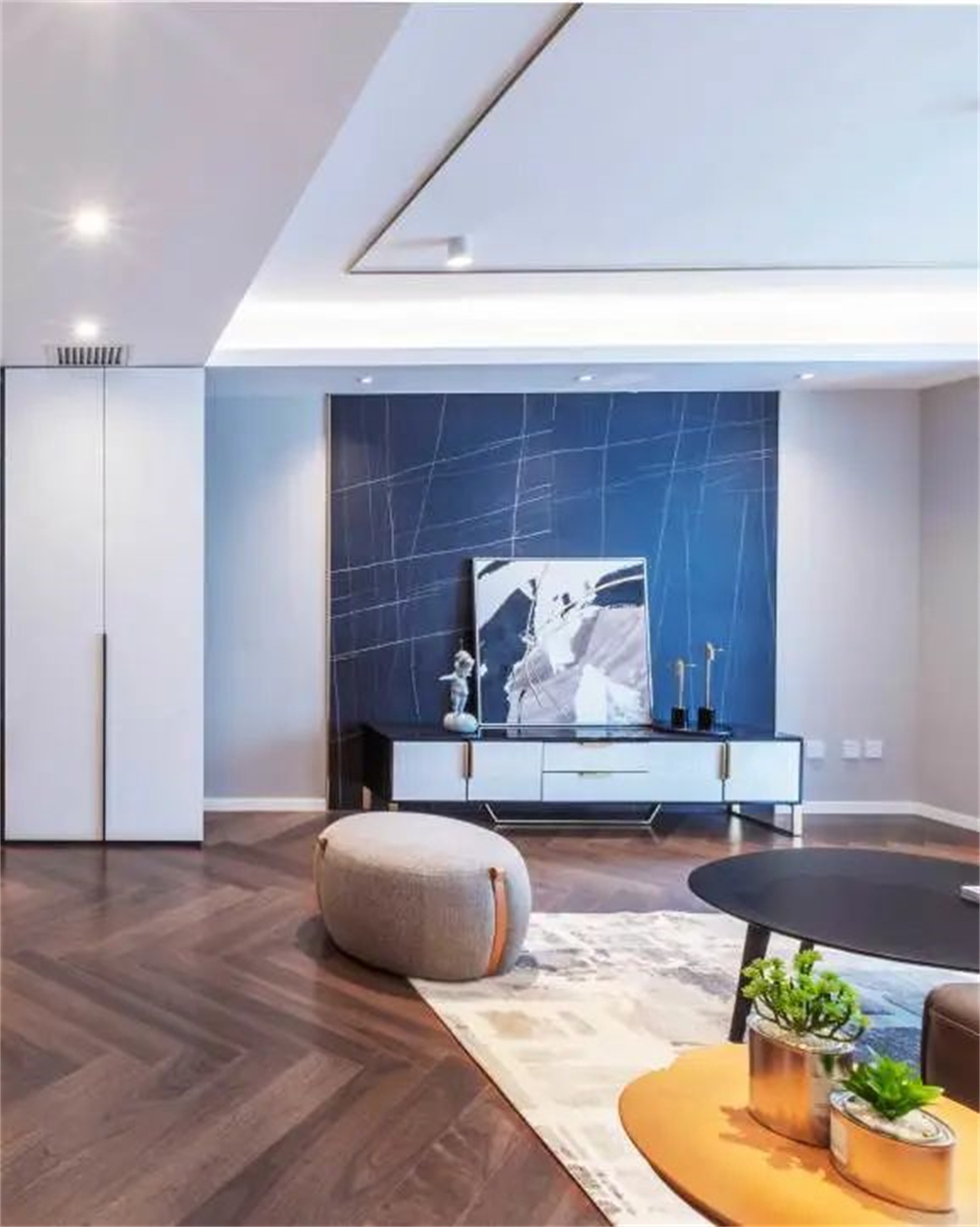地面采用淺色系人字拼橡木地板,木的波紋層層開散,有著自然、靈動的韻味,展示出生活的溫度。